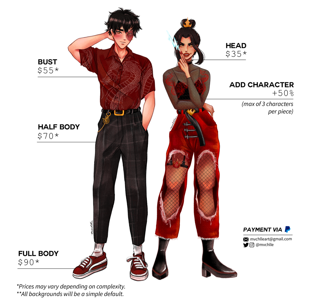 Prices listed are base price quotes. Prices may change due to the complexity of the design or request to add rounds of revisions. Some examples of complexity depend on detail of accessories, clothing, unique features, pose, perspective, lighting, or otherwise.