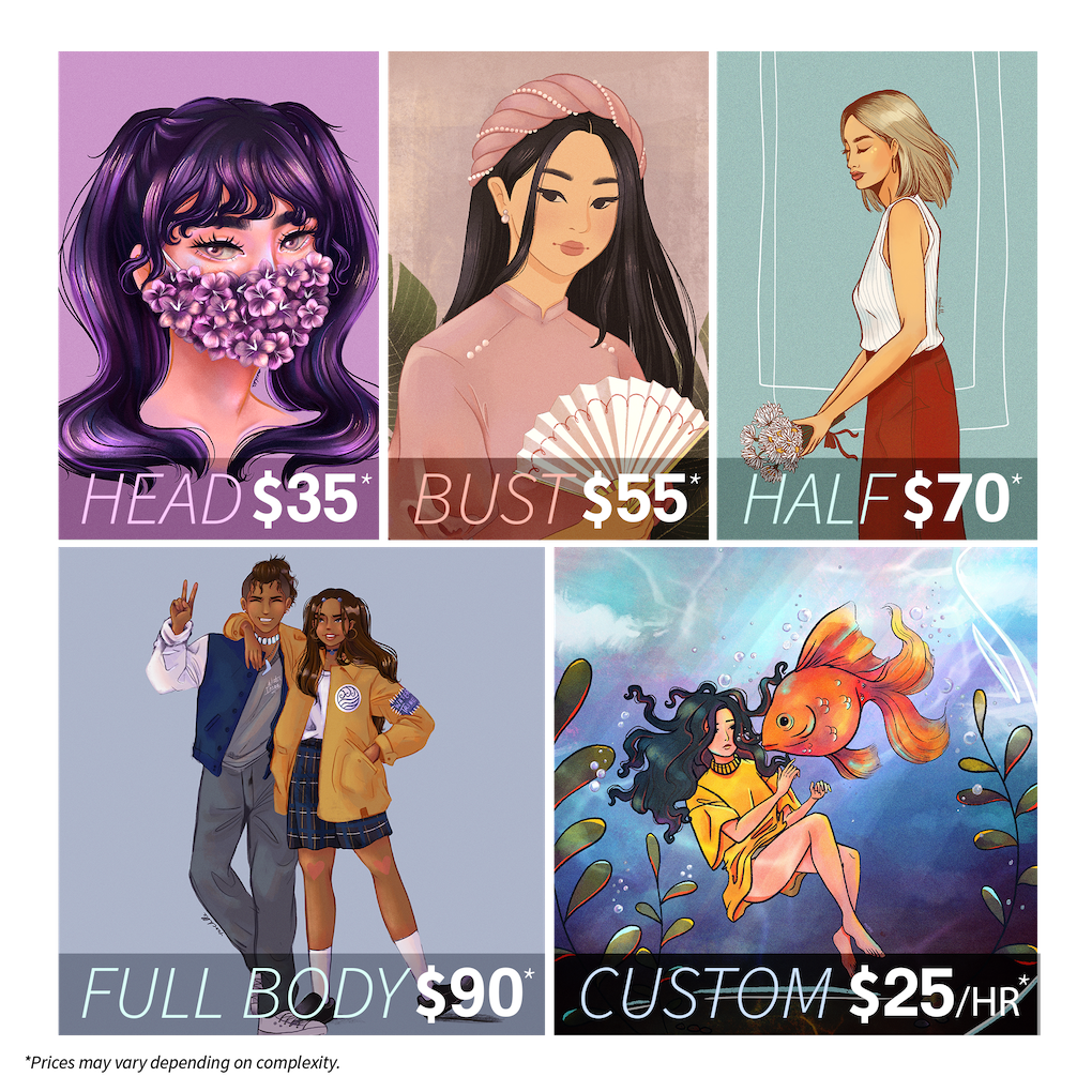 All commissions are character commissions, which come with a default simple background, a minimum of one character, and a max of three. Every added character is an additional 50% of the base price. All characters will be done in my style. Realistic pieces will only be considered for full, custom illustrations.
